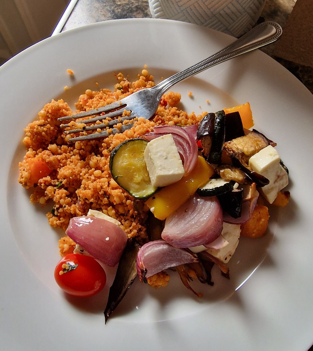 Dinner was various veg, chopped up and roasted simply, with just a bit of oil and seasoning, then some cubes of feta added for the last ten minutes. I had some smoky couscous from Tesco with mine, and thought it was really nice. Mum refused to even try it, as it has butternut squash in it.