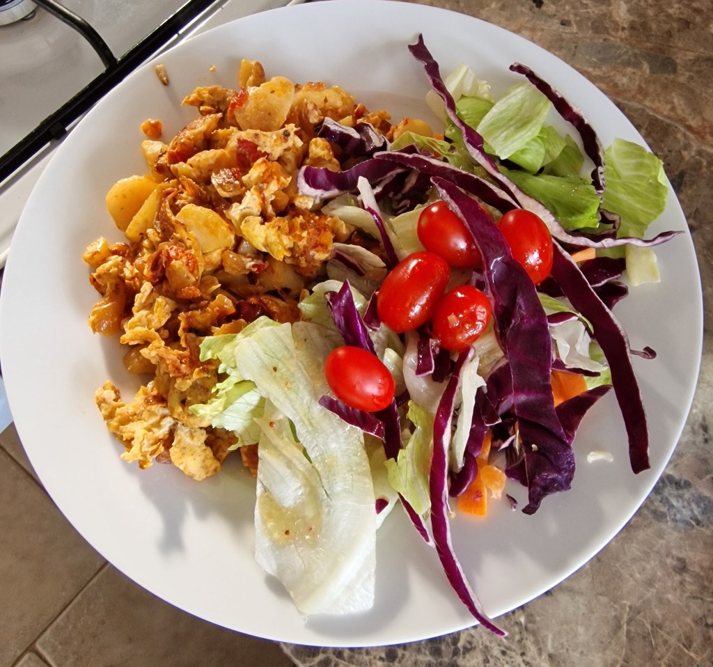 The ‘Spanish-style’, BTW, is because it included potatoes (from a tin) and chorizo, as well as onions (ready-chopped, from the freezer) and roasted peppers (from a jar), so all I had to do was chop the chorizo, and crack and beat some eggs. Easy!