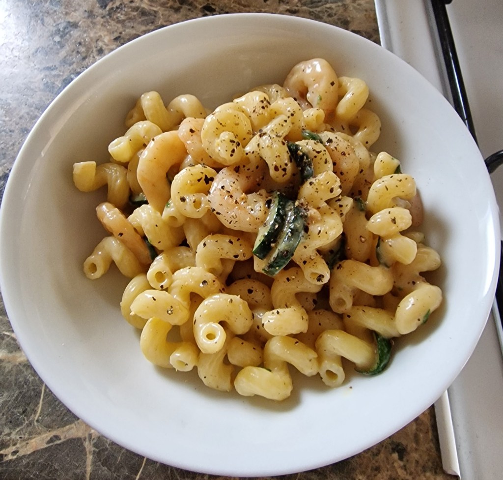 Dinner was pasta, with sliced courgettes and frozen prawns fried in the fat left over from lunchtime’s bacon sandwiches, stirred into hot pasta with a tub of Dolmio brand carbonara sauce. The sauce was a duet of fat and salt, which mixed with the carby pasta to make something both unexciting and immensely satisfying.