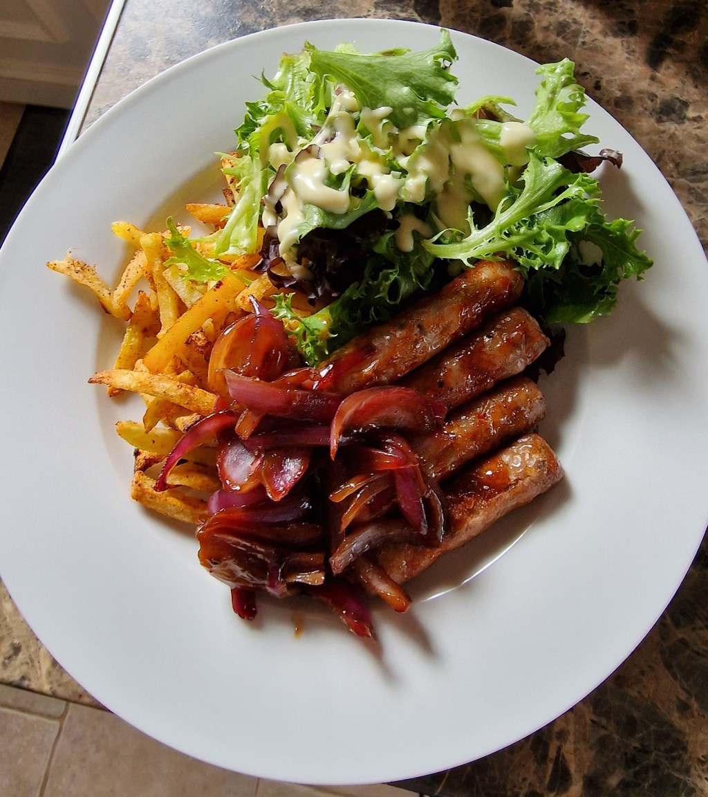 Sticky sausages and spiced chips with salad