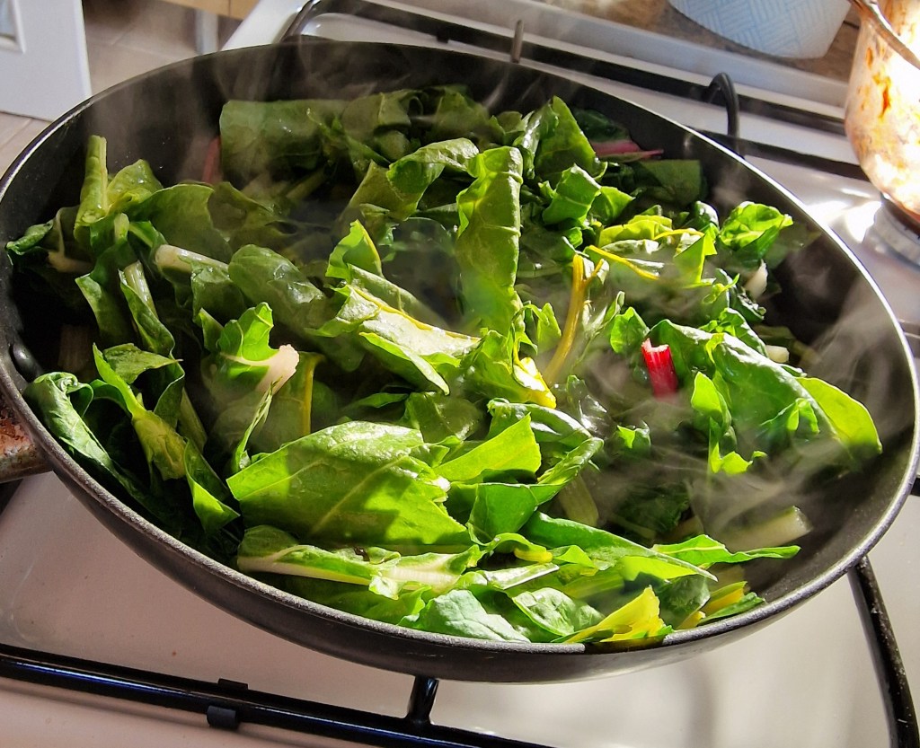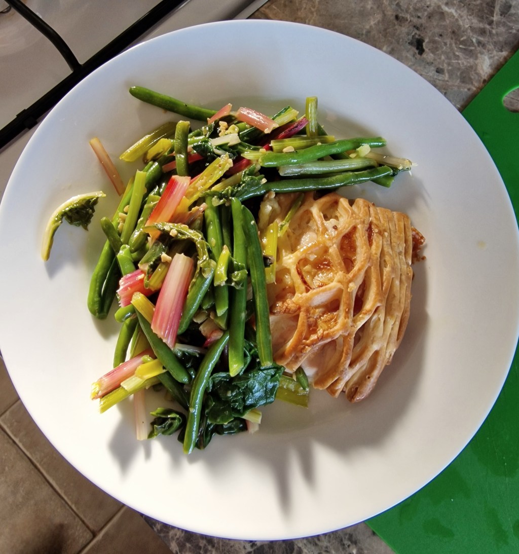 I had somehow forgotten that leafy veg shrinks to nearly nothing when cooked, and had to bulk it out with some frozen green beans. Then I added garlic and butter, which both make nearly anything better1. I thought it was all delicious. Mum said the veg needed to be cooked more, but ate it all so it can’t have been that bad.