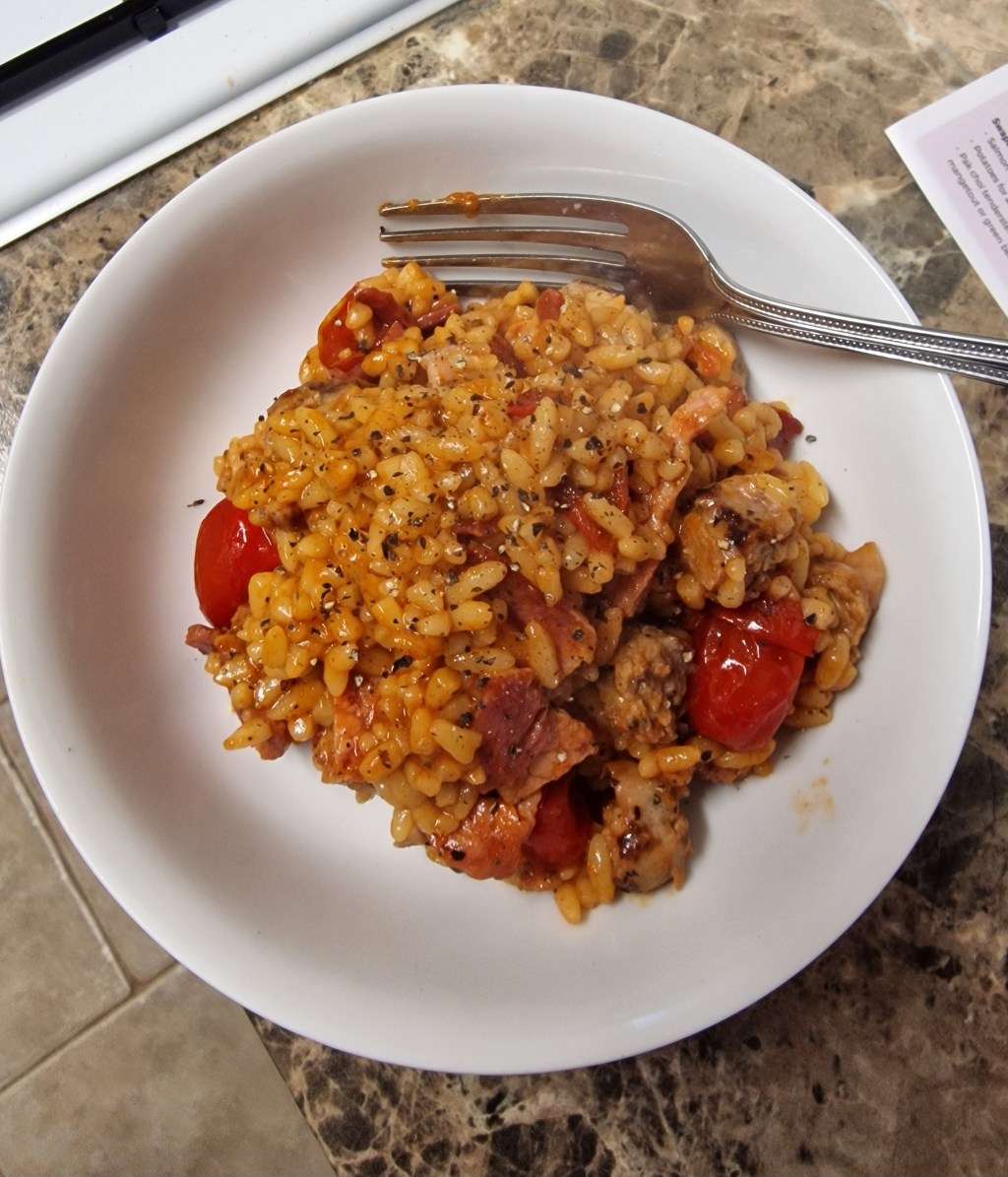 We didn’t have halloumi (although I’m working on converting mum to the pleasures of squeaky cheese), but we did have bacon, and sausages, and my brain somehow combined these things into full English orzotto. 🤷♂️