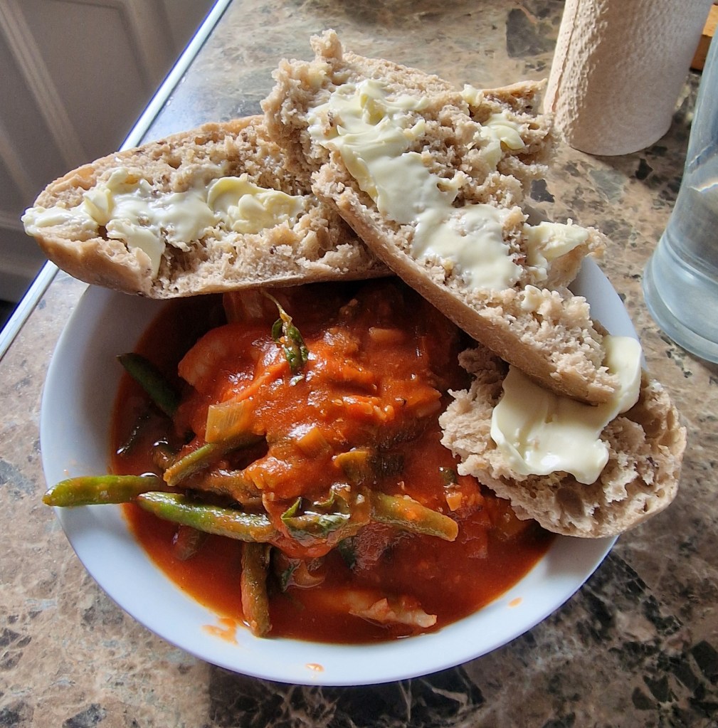 (The recipe, such as it is, goes: soften washed and sliced leeks in a little oil over a low heat. Then add some chopped garlic and smoked paprika and cook for a few seconds. Add passata, frozen green beans, frozen white fish fillets, and a few frozen king prawns, plus a bit of veg stock or water. Season generously, and simmer until the fish is cooked and flakes when prodded with a knife, and the prawns have turned pink. Serve with bread to mop up the sauce.)