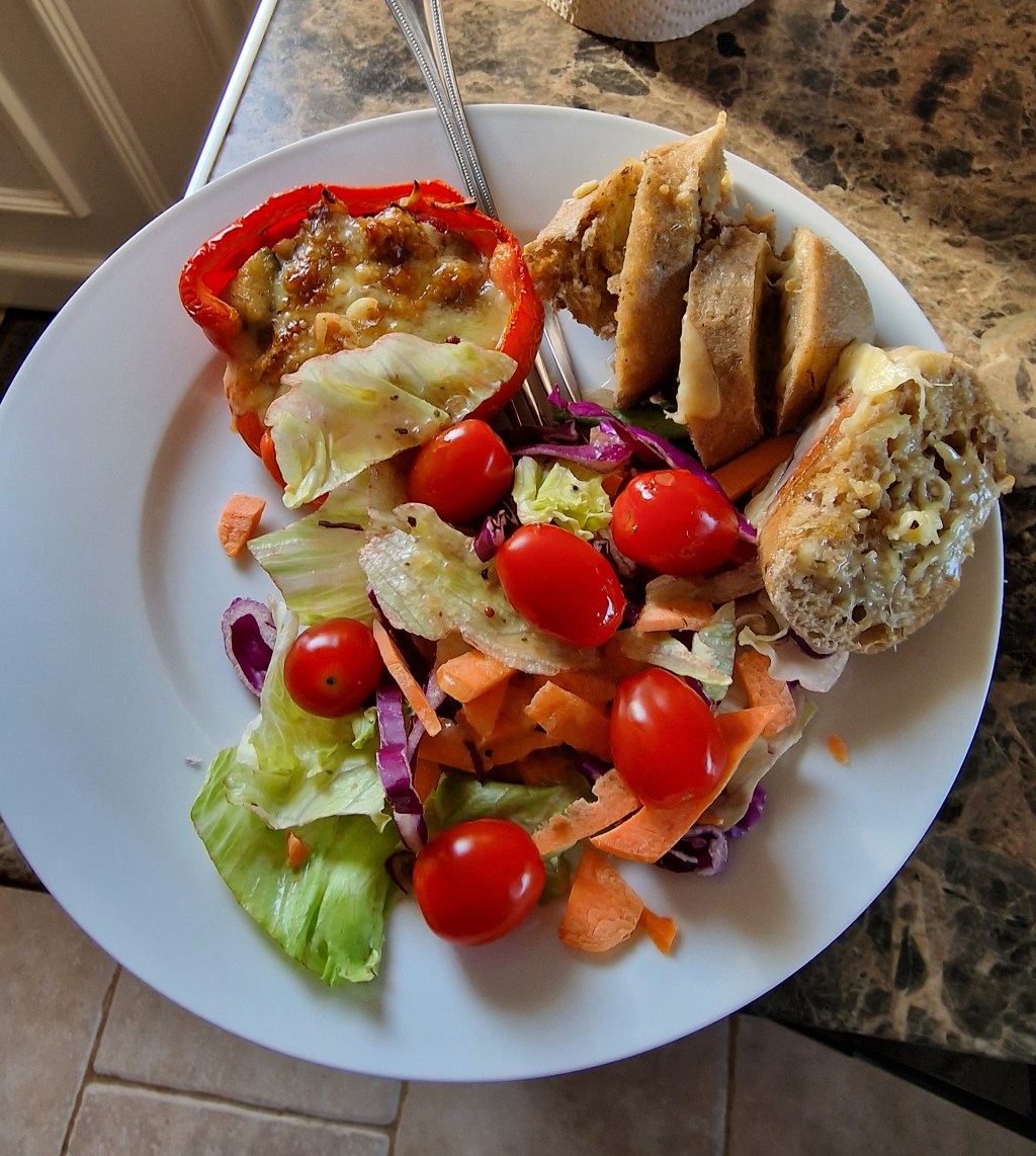 Tonight was another mum favourite, stuffed roasted peppers. Mum spied me taking them out of the oven, and went “ooh, I like those!” Anyone would think that I deliberately cook things she likes or something.