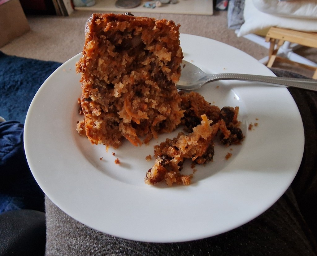 I’m glad I listened, as it turned out not to be carrot curry cake but a decently-spiced carrot cake. It’s sadly without cream cheese frosting, because of the aforementioned dairy exclusion, but it’s very good all the same.