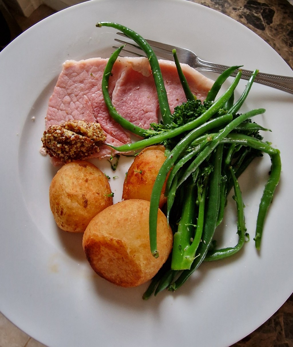 Gammon steaks, roast potatoes, green veg; mixed berry pie and non-dairy cream