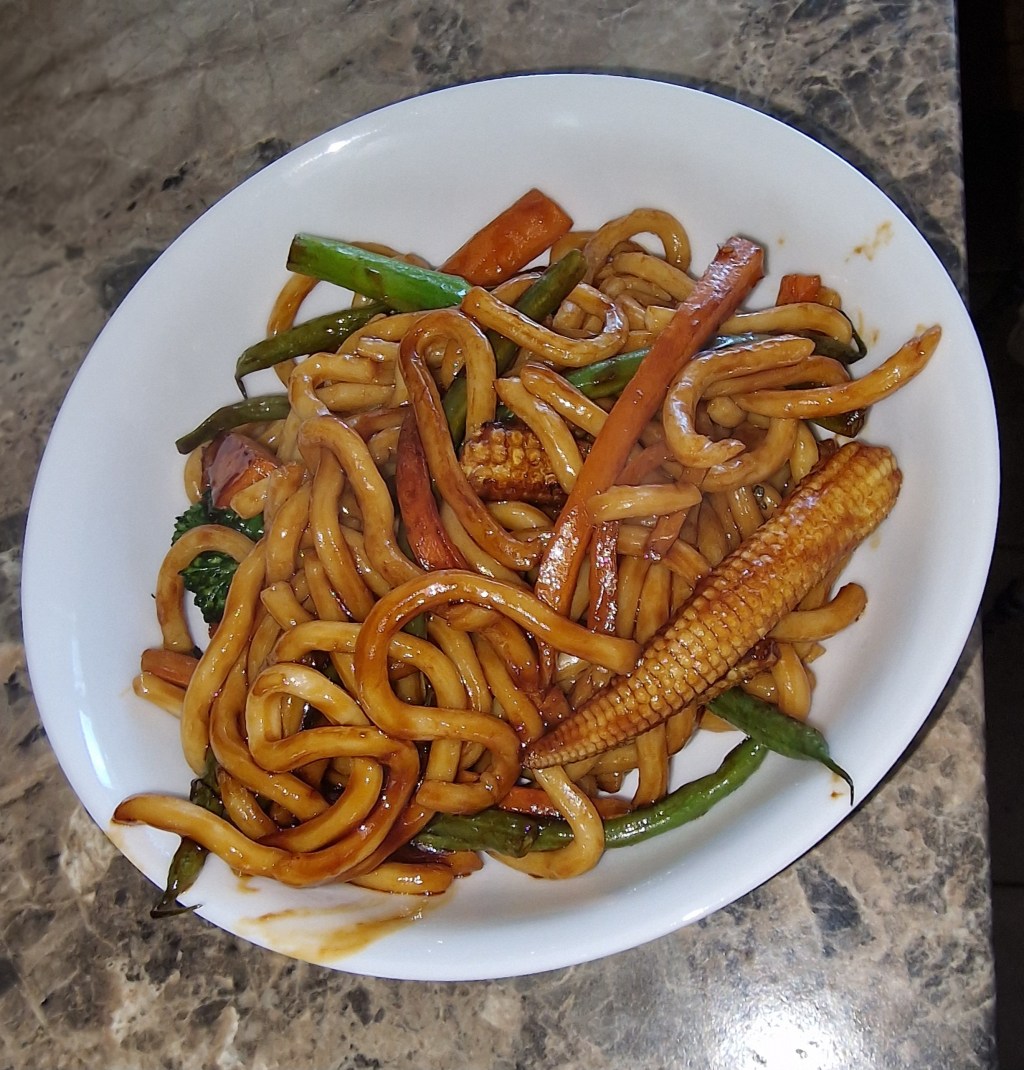 Dinner was about as complex as I could manage: a pack of mixed veg stirfried in a splash of oil, then some teriyaki sauce poured over and pre-cooked noodles stirred in. It was very tasty, as a mix of fresh veg, sweet sauce, and carbs is always going to be.