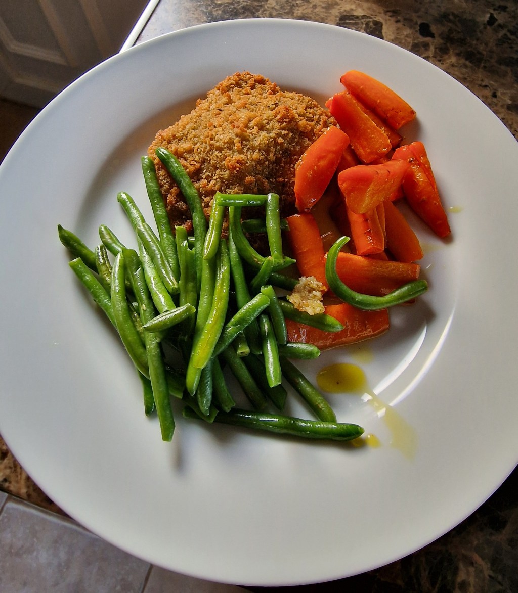 Dinner was wild garlic chicken kyivs from Tesco’s Finest range, a favourite of mine since pre-living with mum. I added a carrot (a very large carrot), chopped into pieces of varying shapes and sizes (because of knife wielding incompetence, not design) which roasted up beautifully in the butter that leaked out of the kyivs. Mum said “these orange bits are really nice”, which I took as quite a compliment. The green beans were cooked in the Michelin star-worthy manner of chucking some frozen ones into pan and stirring them around until hot.