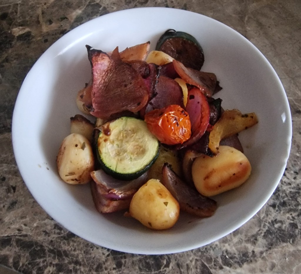 - Using the highly complex method of mixing some tinned potatoes and a tray of veg together, pouring the lot onto a baking tray, and sticking it in the oven until cooked. Mum actually asked for seconds, which was a shame as we had already eaten it all. ↩︎