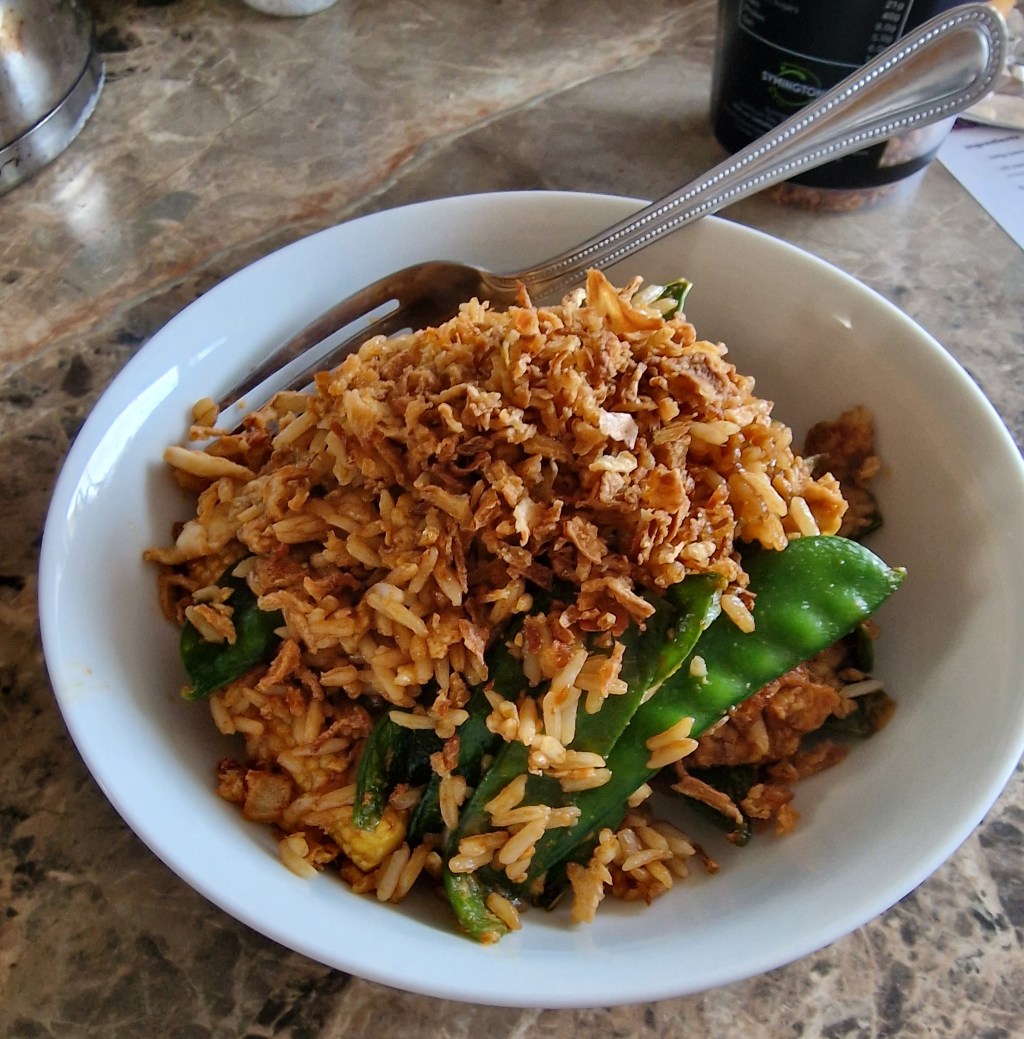 Anyway: dinner was nasi goreng (Indonesian fried rice), using spices from Simply Cook. It should have been really quick and easy to cook, except the egg that I cracked into the pan imploded and showered bits of shell everywhere (note to self: crack the egg into a bowl first, to avoid shell-based emergencies).