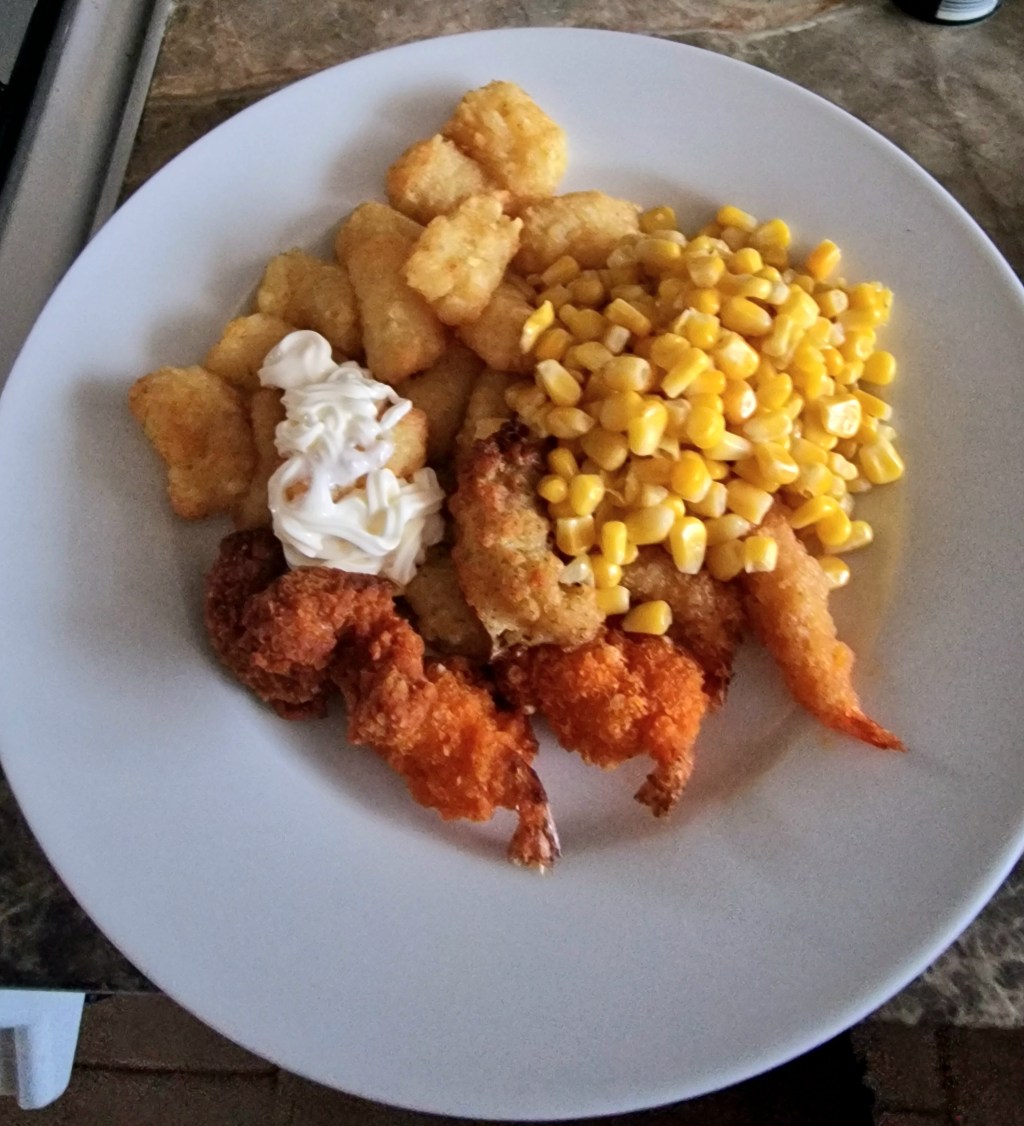 Dinner was a classic orange-stuff-from-the-freezer deal: breaded king prawn selection, from Tesco’s C-word1 range, mini hash browns, and sweetcorn with a bit of Aromat seasoning. The prawns were just OK, a bit small for king prawns and, in the case of the spicy bbq ones, hot enough for even me to notice the kick.