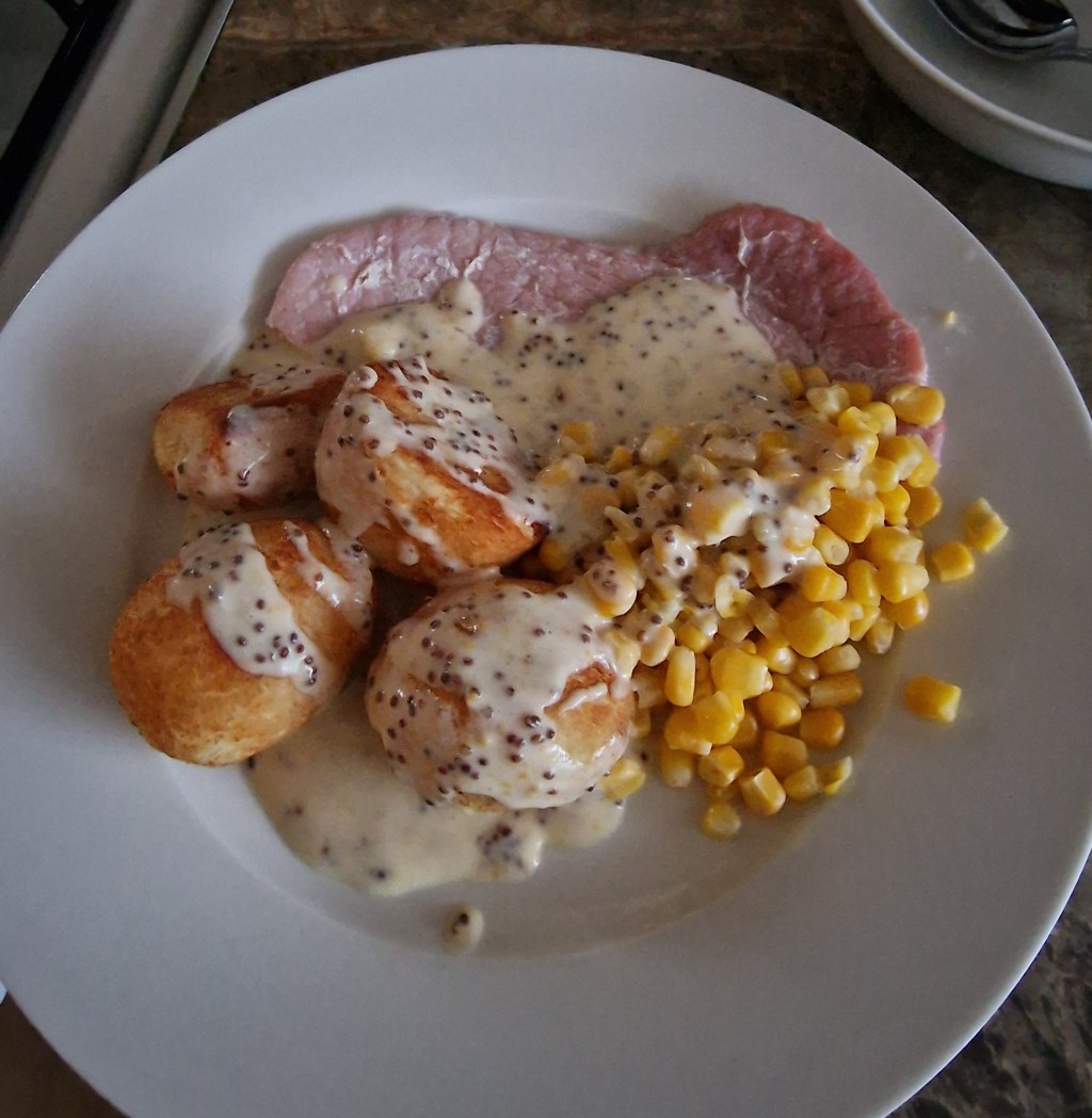 Dinner was all stuff from the freezer, made a little fancier with a homemade honey mustard sauce: the gammon pan juices mixed with all the honey left in the bottle (about a teaspoon and a half, I think), the same amount of wholegrain mustard, a generous splash of cream, and a couple of shakes of Aromat seasoning with a splash of water in place of stock.