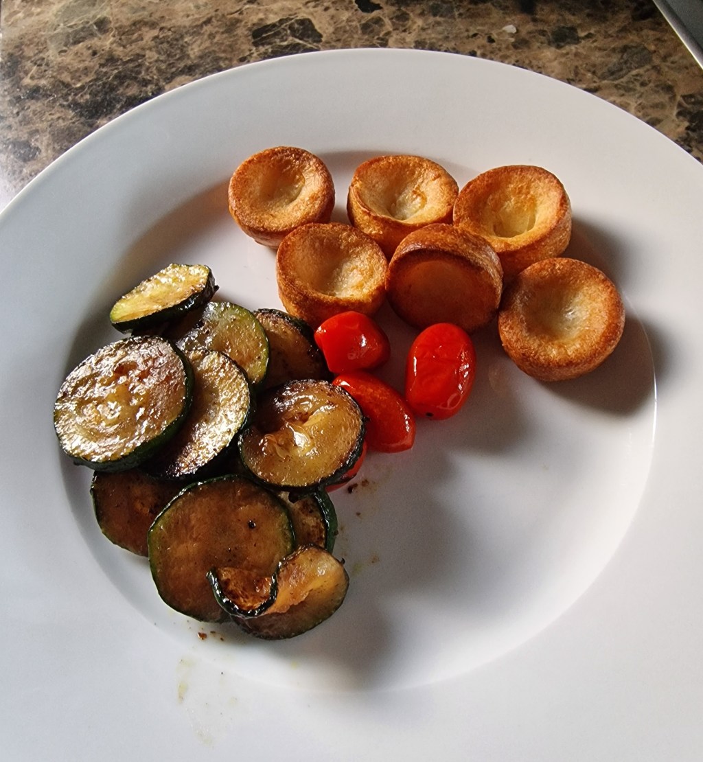 Before that was a simple meal of sliced courgette and baby plum tomatoes, cooked in bacon fat left over from our lunchtime sandwiches, served with mini Yorkshire puds. If you think it looks like a day-before-grocery-shopping meal, you would be entirely correct.