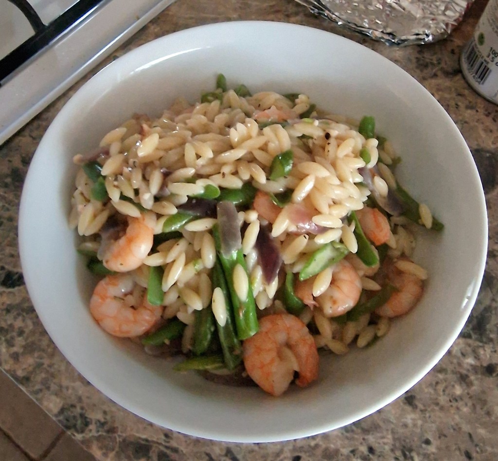 Dinner was a lemony king prawn orzotto, a favourite of mine that mum fortunately also likes. The lemon is dried and then cooked so doesn’t generally cause an allergic reaction the way the fresh stuff does, although I’ve got a sore throat anyway after my ill-advised attempt to inhale my pasta failed.