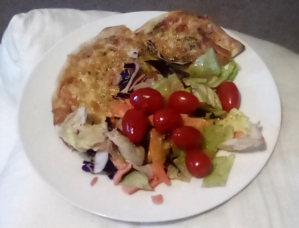 Dinner was homemade pizza: ready-made dough from The Northern Dough Co (highly recommended, btw), topped with passata from a jar, grated mozzarella and cheddar from a bag, and some cracked black pepper. Done and in the oven in five minutes, and cooked in about ten. Mum doesn’t usually care much for pizza, but this one got the coveted ‘yum’.