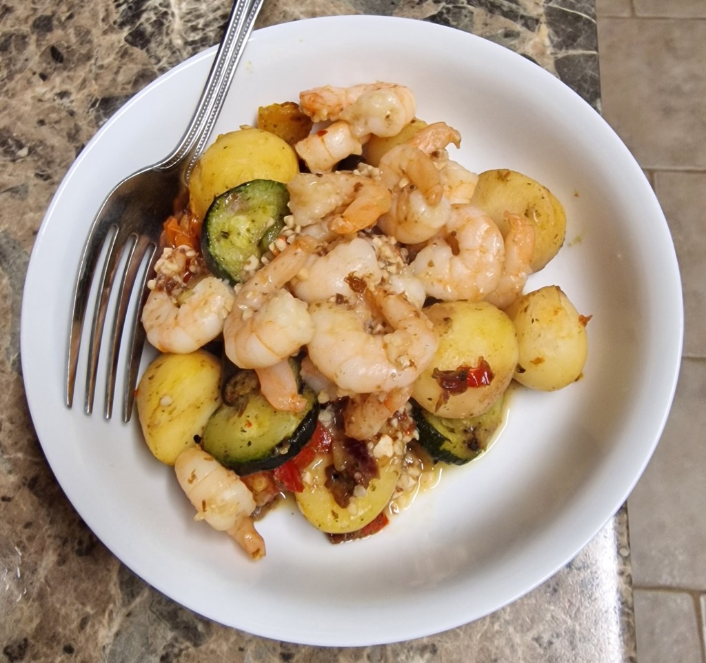 Dinner was meant to be prawn laksa, from a kit1, but mum didn’t fancy it so I changed it to something I knew she would like. I added a tiny bit of chilli to the prawns, which mum didn’t notice (or if she did, she didn’t mention it), which to me made them particularly nice.