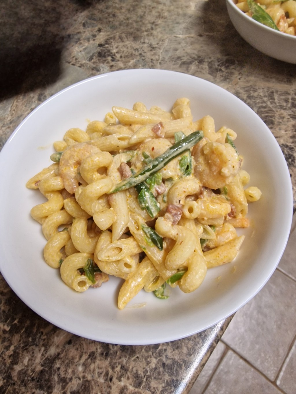 The triage nurse at the hospital yesterday told mum very firmly that she needs to eat more, so I abandoned my plan to cook jambalaya, which mum tolerates occasionally because she knows how much I like it, and instead did pasta with some of the flavours of jambalaya: chorizo fried until it released its fat, then green beans and prawns direct from the freezer, then a bit of cajun seasoning and a splash of cream once the prawns were defrosted and starting to change colour. Stir through hot pasta and serve.