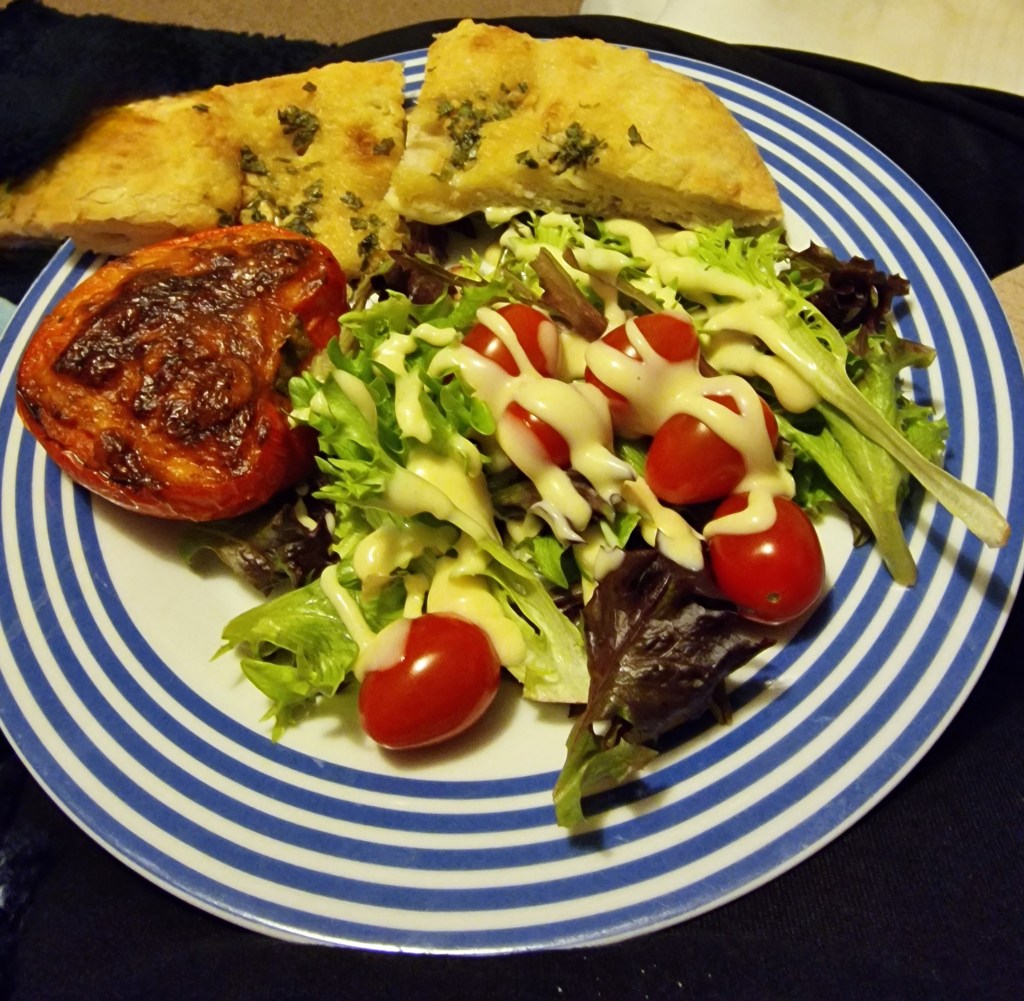 Tonight’s edition of “things mum likes to eat” was risotto-stuffed peppers (ready-made from Tesco, rather than homemade, this time) with salad and garlic flatbread. Mum ate all of her half pepper, lots of salad, and most of half of the flatbread, which was a vast improvement on her recent food intake. She commented that the stuffed pepper wasn’t the sort of thing she usually liked but that it was pretty good, which I’ll take as a verdict.