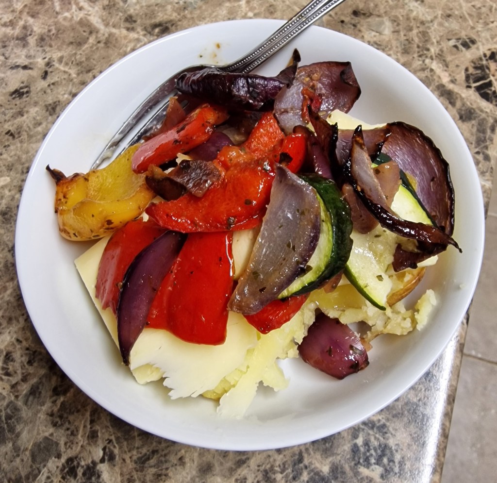 Jacket potato with cheese and roasted Mediterranean veg