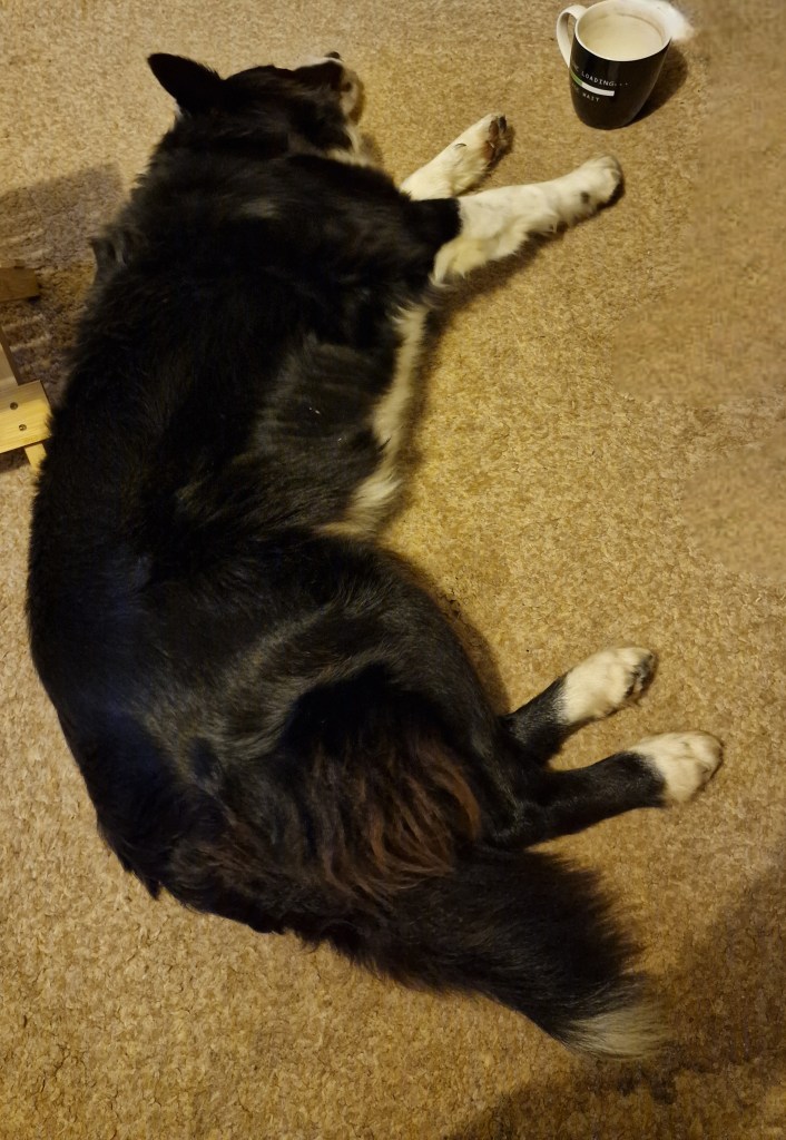 Then they came back and we all, plus doggo, sat in the living room and chatted about various things, while I gave doggo belly rubs in exchange for very many kisses. I adore this dog, even when she followed me into my room and tried to get under the bed, for reasons only she knows.