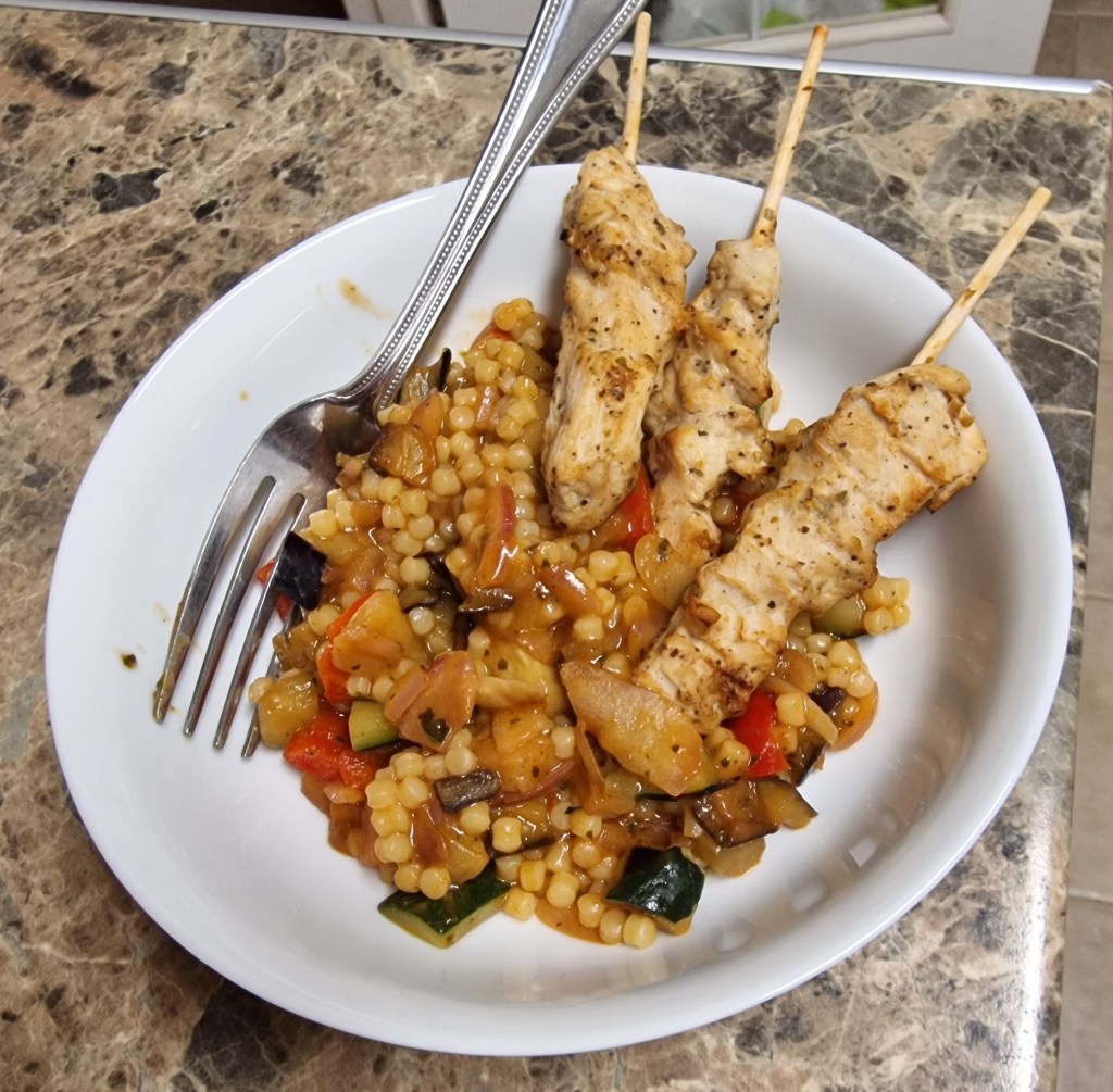 Chicken souvlaki skewers with Mediterranean vegetable giant couscous
