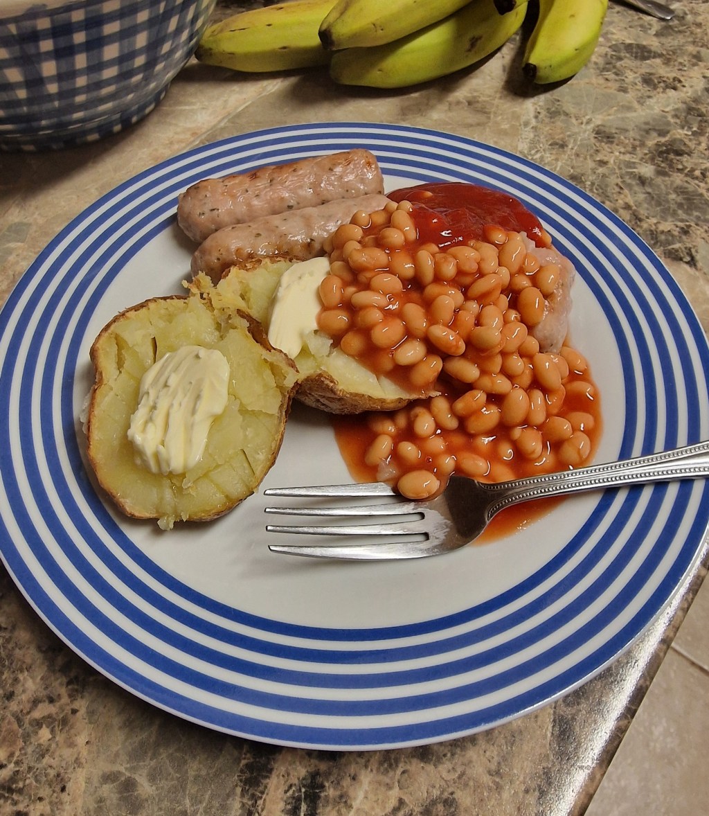 Jacket potatoes with sausages and beans