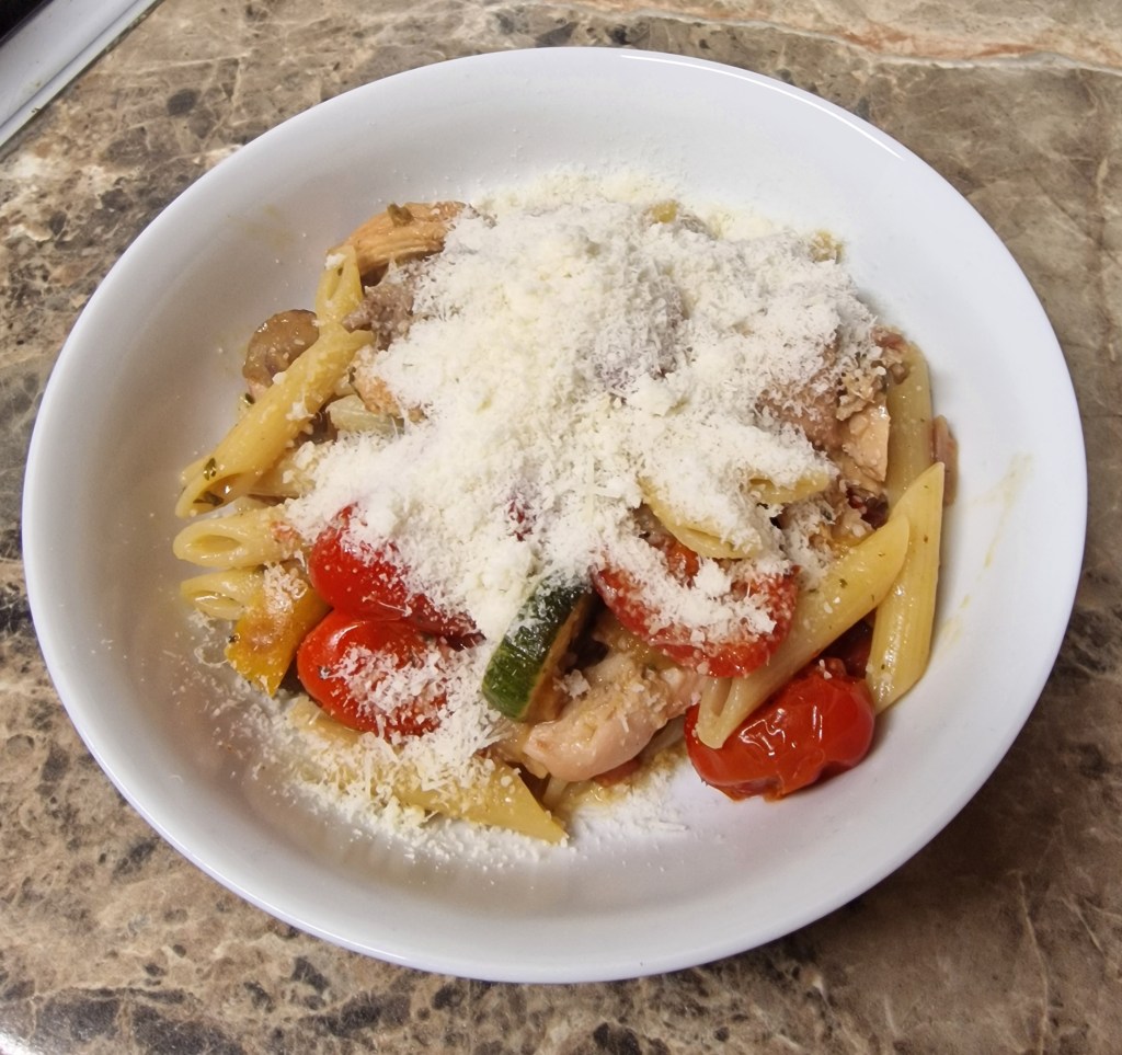 Dinner, which was cooked using a Simply Cook kit but not quite in the intended way: I roasted the chicken rather than frying it, roasted some frozen Mediterranean veg alongside the chicken to take the place of fried peppers and onions, and used a splash of milk rather than creme fraiche as we didn’t have any. And, of course, I used less than half of the mild spice mix, because we know how mum reacts to spices.