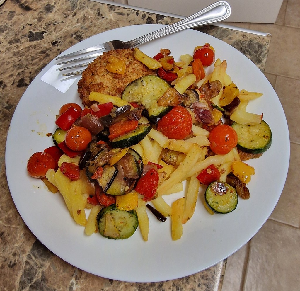 Then I did one of my favourite “shove everything on a baking tray” meals. Mum said she didn’t want a fishcake, but changed her mind once they were cooked (which is why I cooked both of them). She said she’d served herself too much and couldn’t possibly eat it all, then ate all except the last few bites of the fishcake. (Well done mum! 👏)