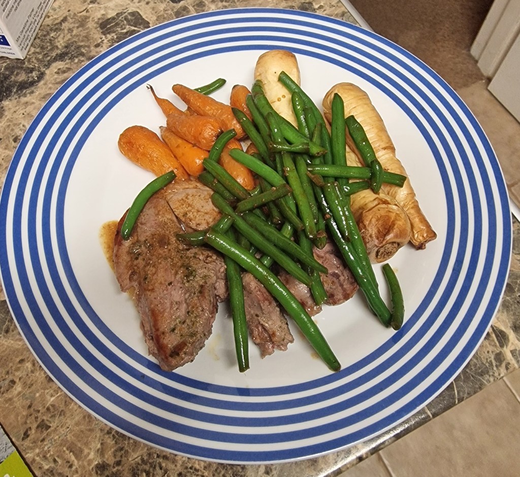 For dinner I just did lamb leg steaks, sprinkled with some roasted garlic, rosemary and sea salt seasoning (from my Advent calendar, of course), with roasted mini carrots and parsnips and some plain green beans. It was nice enough.