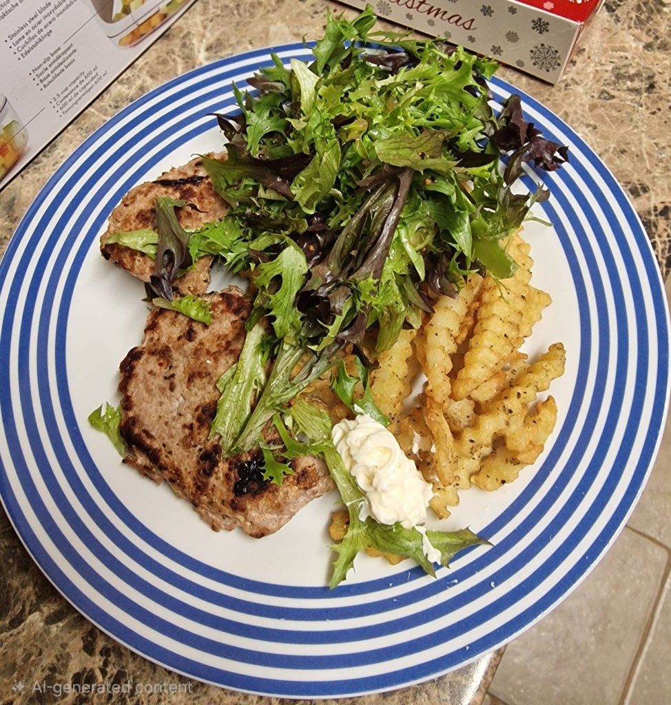 I mixed it with some crispy fried onions and some lemon pepper seasoning from my Advent calendar, then simply fried them and served them with oven chips and salad. As usual, I thought it was good, while mum ate hers without comment.