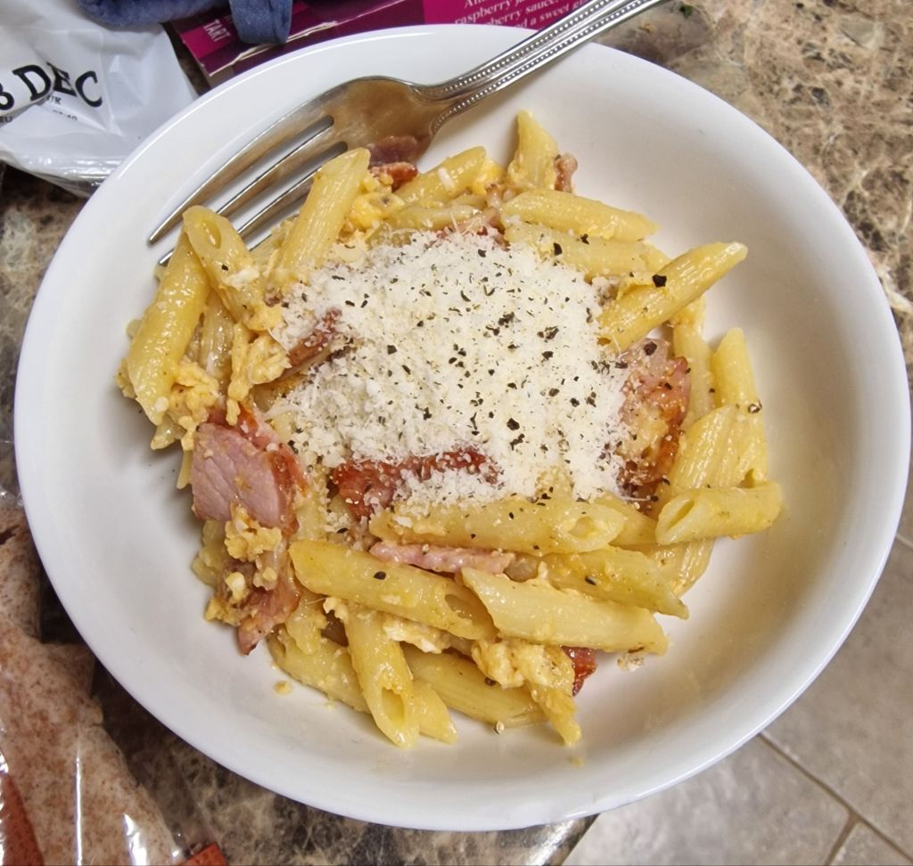 For dinner I did one of my favourite pasta sauces, carbonara. My version isn’t 100% authentic – sorry, Italian purists, but British back bacon was what I had in the fridge – but it takes less time than it takes to boil water and cook pasta, and is salty, savoury, and wonderfully comforting.