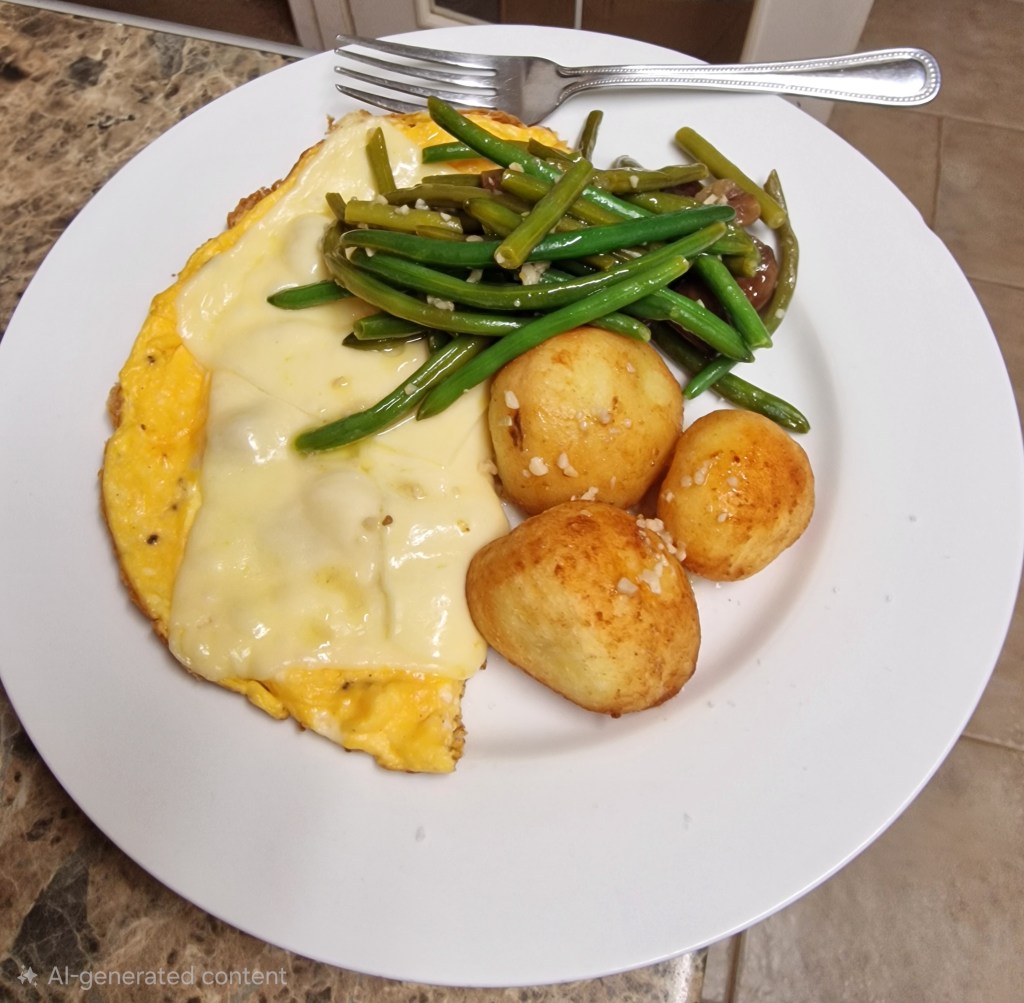Gammon and emmental omelette, green beans and chestnuts in garlic butter, roast potatoes