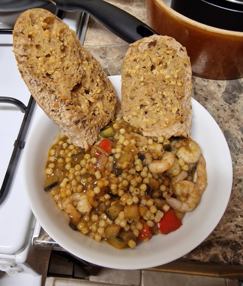 - Recipe: take one bag of frozen couscous and vegetables, and one bag of frozen prawns, dump the contents of both in a pan and heat through until the sauce is bubbling and the prawns are cooked. âŠī¸