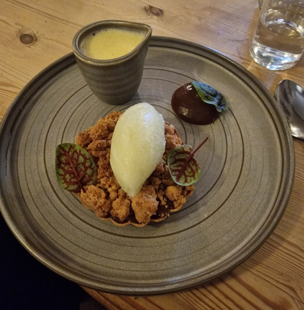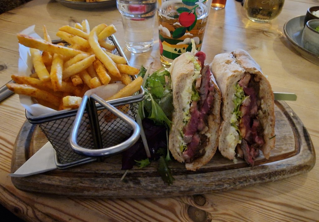 Everyone opted for fish and chips, while I went for the rare (in every sense!) treat of a steak ciabatta roll1 and paprika fries. It was delicious, as was the apple and cinnamon crumble tart with apple sorbet and creme anglais I had afterwards. (You know the place is posh when it serves creme anglais rather than custard!)