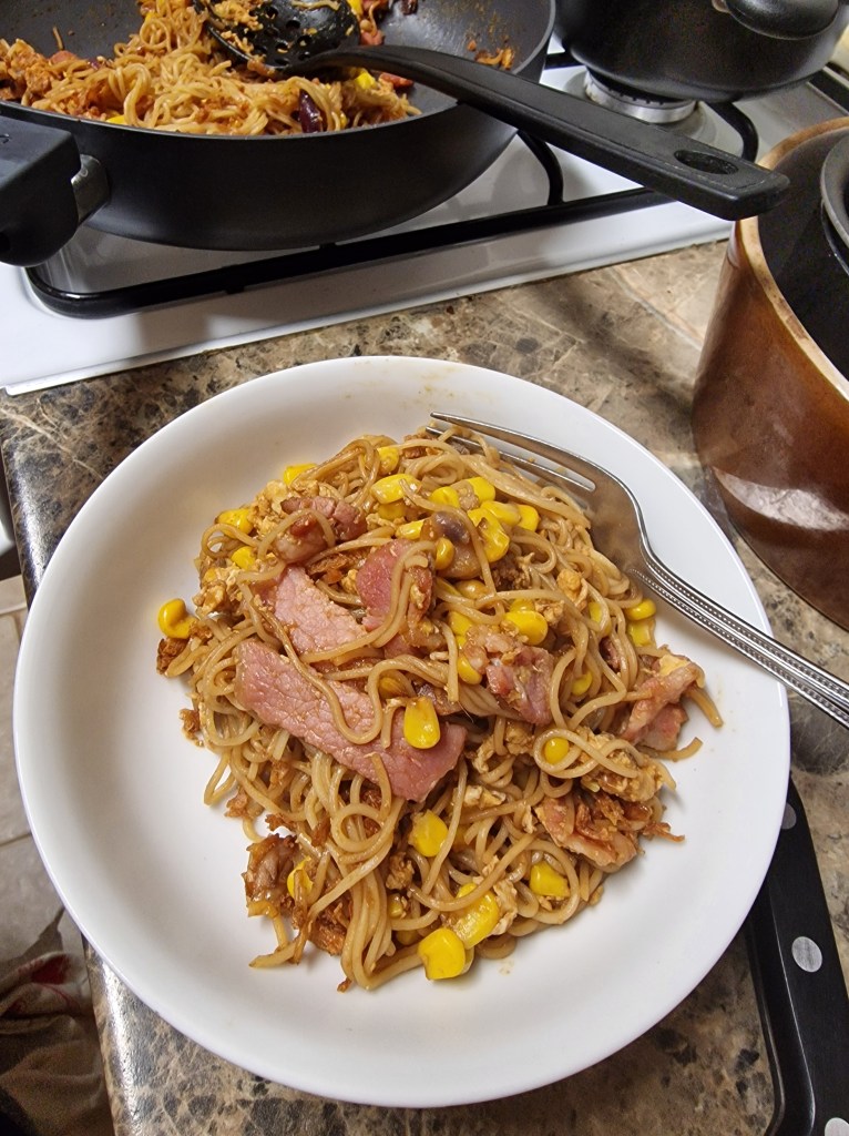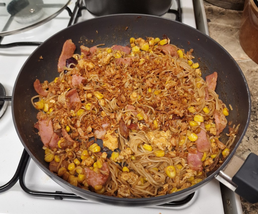 So we ended up with noodles with bacon, egg, and sweetcorn, flavoured with nasi goreng spice paste, and it was really quite nice for such a mishmash of flavours.