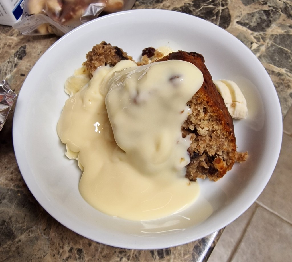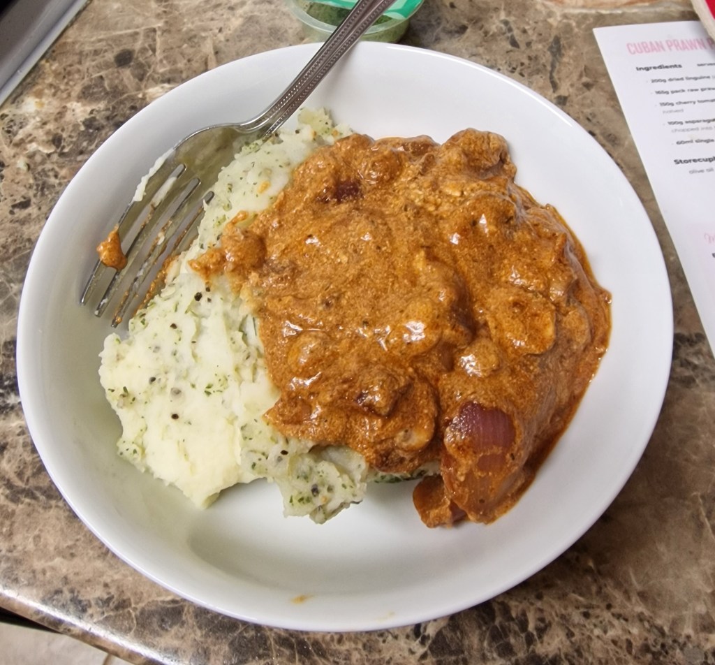 So I made mushroom stroganoff, using a Simply Cook kit. The accompanying mash was ready-made, and I divided it in half so mum could have plain mash and I could have horseradish mash. Even with this adaptation, it’s not the sort of meal that mum enjoys, and it’s testament to her hunger levels that she ate it all and scraped the bowl clean.