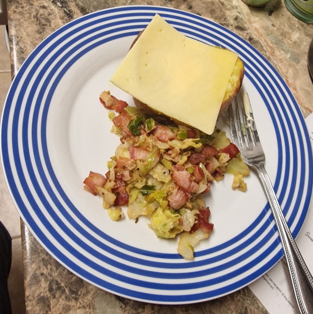 Dinner was a mum favourite – jacket potatoes – combined with a me favourite – cabbage with bacon and garlic. If you’ve never tried it, do: it’s a delicious combination. Make sure you put more cabbage in the pan than you think you need, though: I always forget, as I did this time, how much it cooks down.