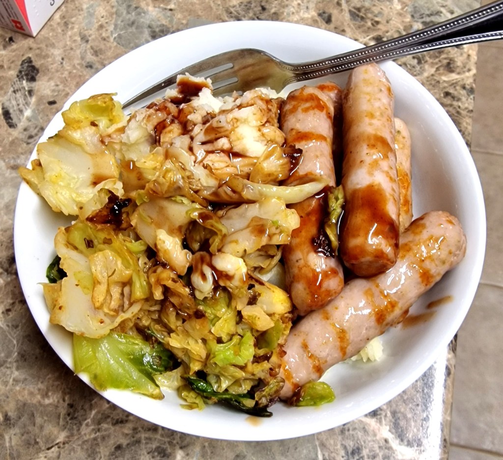 Sticky sausages, smoky cabbage, and mash