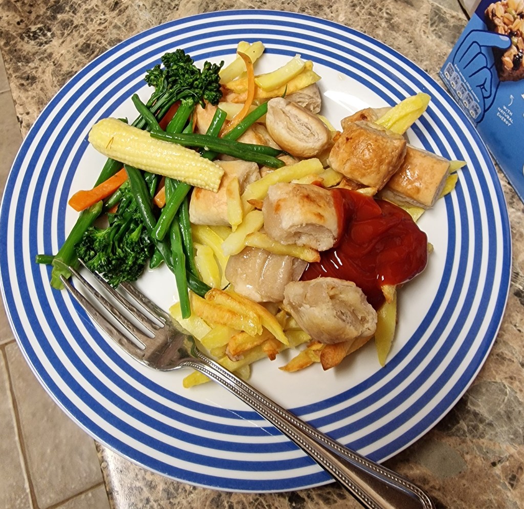Cheese and onion rolls, chips, and veg