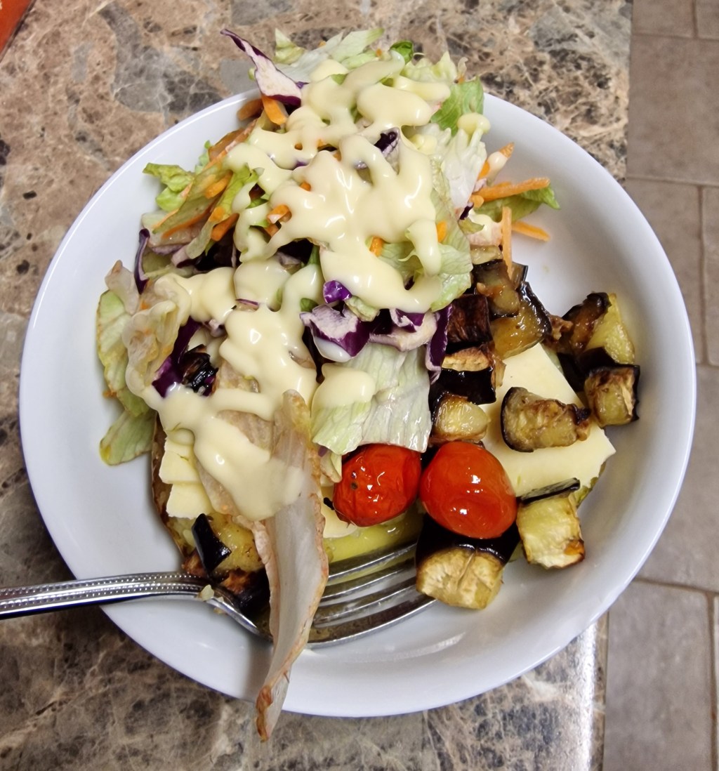 Jacket potatoes with roasted aubergine and tomatoes, and salad