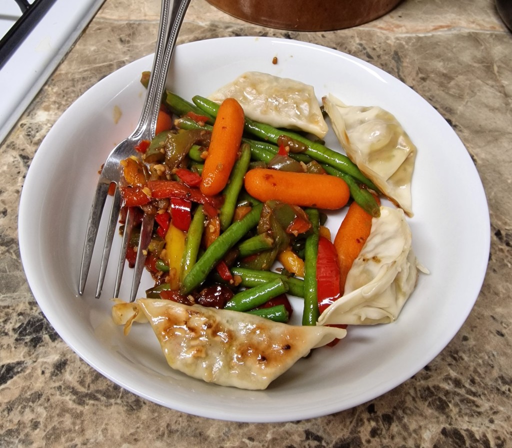 First we had stirfried veg with vegetable gyoza, which mum had previously tried and disliked, but re-tried and enjoyed enough to have seconds this time. I really can’t predict what mum will or won’t enjoy anymore.