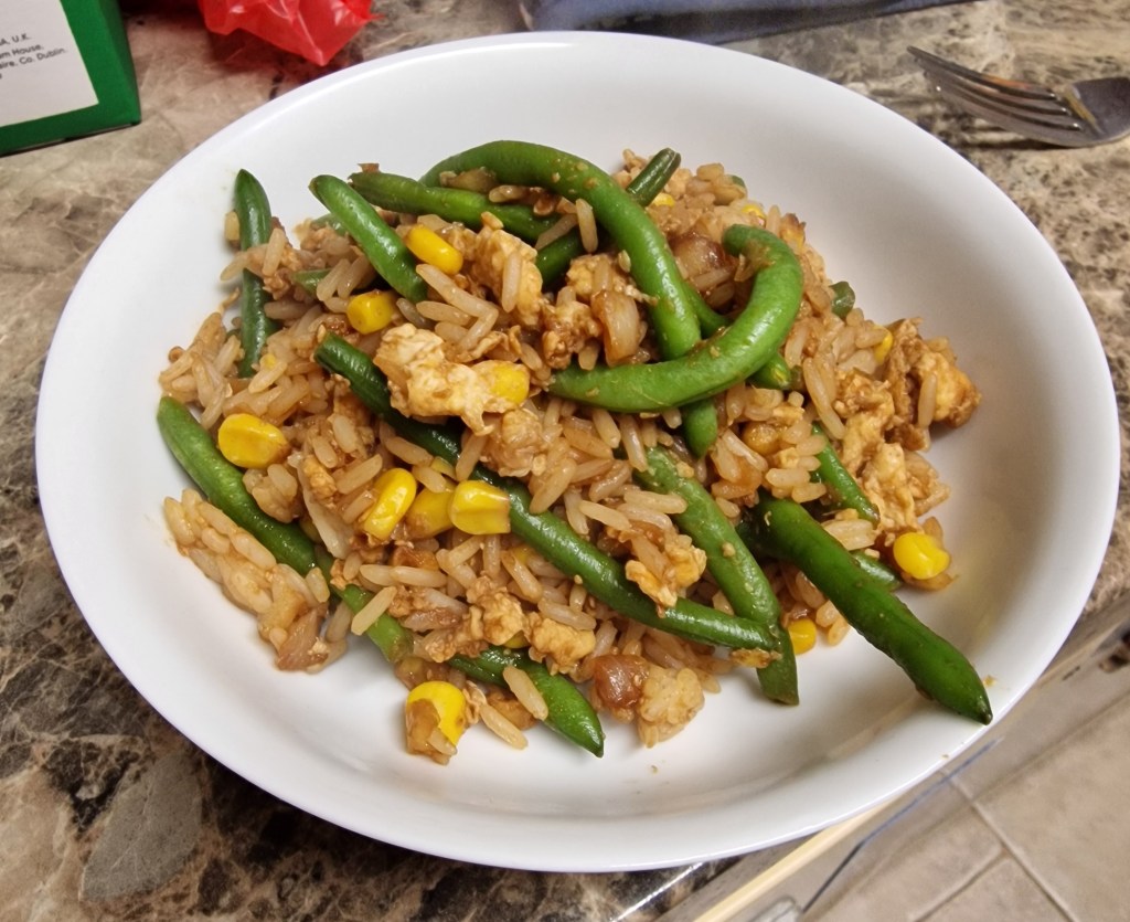 For dinner I made fried rice, which mum has previously greatly enjoyed but this time found too dry and drowned in her favourite salad dressing. Because there’s not enough liquid sloshing around in the world already.