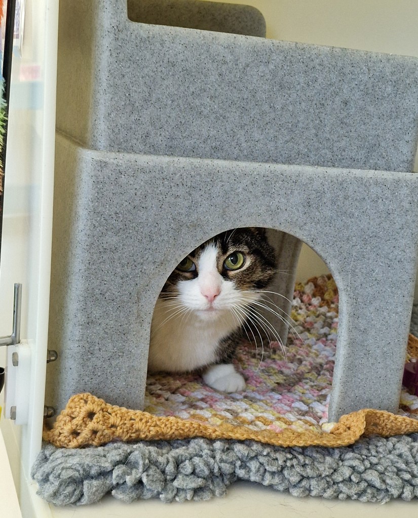 We went off to do the required paperwork, then I sneaked back to take some photos of our new moggy. As her pen door was shut again, Smokey-puss gave me a look of such betrayal that my heart cracked a little. I told her I would come back for her as soon as the vet gives her clearance (she’s currently being treated for a UTI, which I thought was quite appropriate given mum’s problems), but she didn’t understand and mewed pitifully as I walked away. ๐ญ