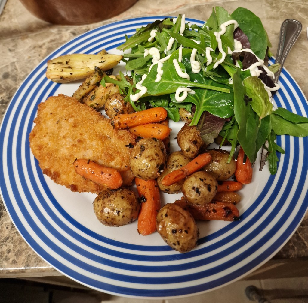 Then it was time to cook dinner, and it was another of my favourite traybake dinners: breaded chicken and roast parsnips (both from the freezer), roast baby carrots and roasted, marinated potatoes (from Tesco).