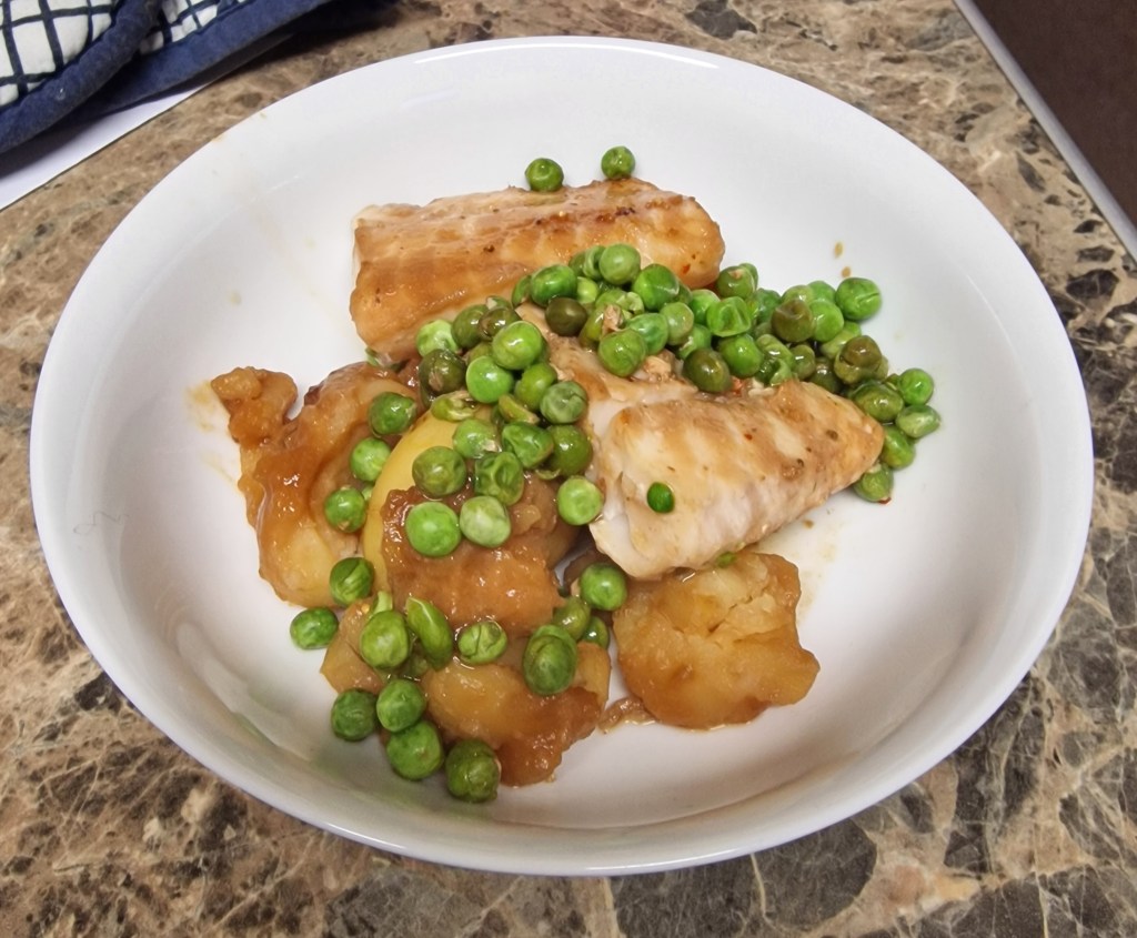The doctor at the hospital told me that, to stop further agonising gallbladder incidents, I should avoid anything with fat or dairy. That necessitated a quick rethink of the week’s meal plan, including tonight’s dinner. This easy fishy dinner contained no fat (except the trace amounts in the ingredients) and, if not wildly exciting, was at least warm and filling.