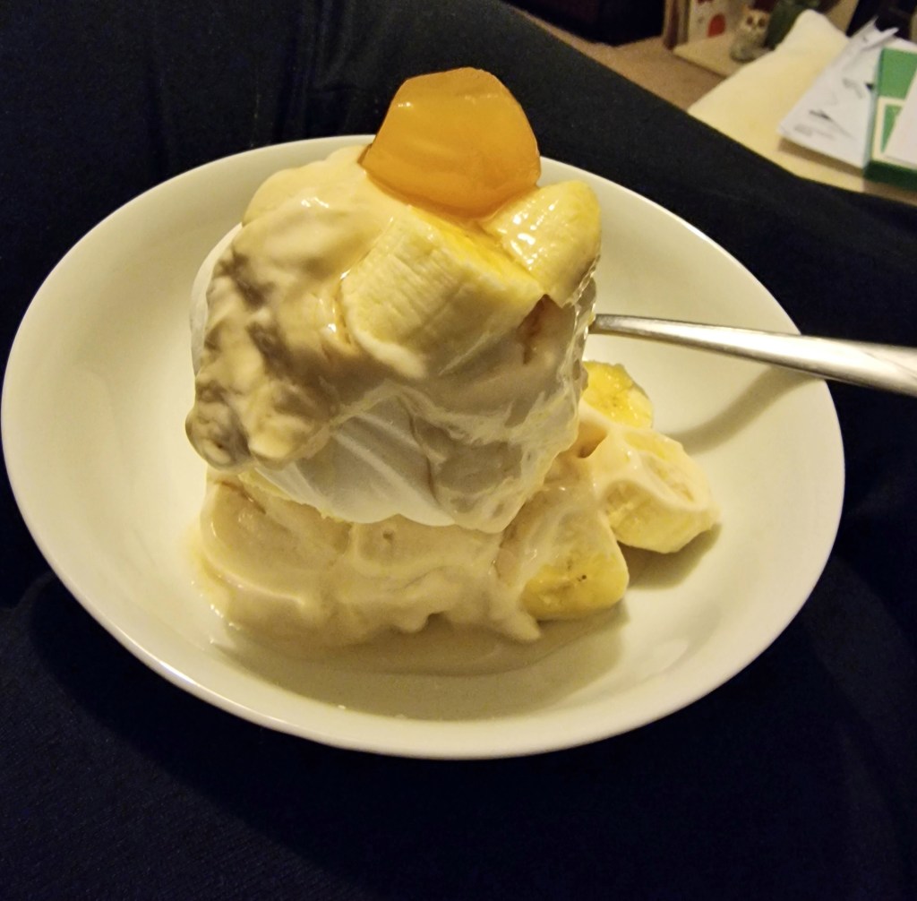 I wasn’t hungry, but made myself a fancy stacked dessert, of two meringue nests, a honey and ginger yoghurt (full fat, because that’s what we had, and the one I ate yesterday didn’t hurt me), a chopped banana, and a cube of preserved ginger in syrup (which I chopped up before eating). It was delicious in a very sweet sort of way.