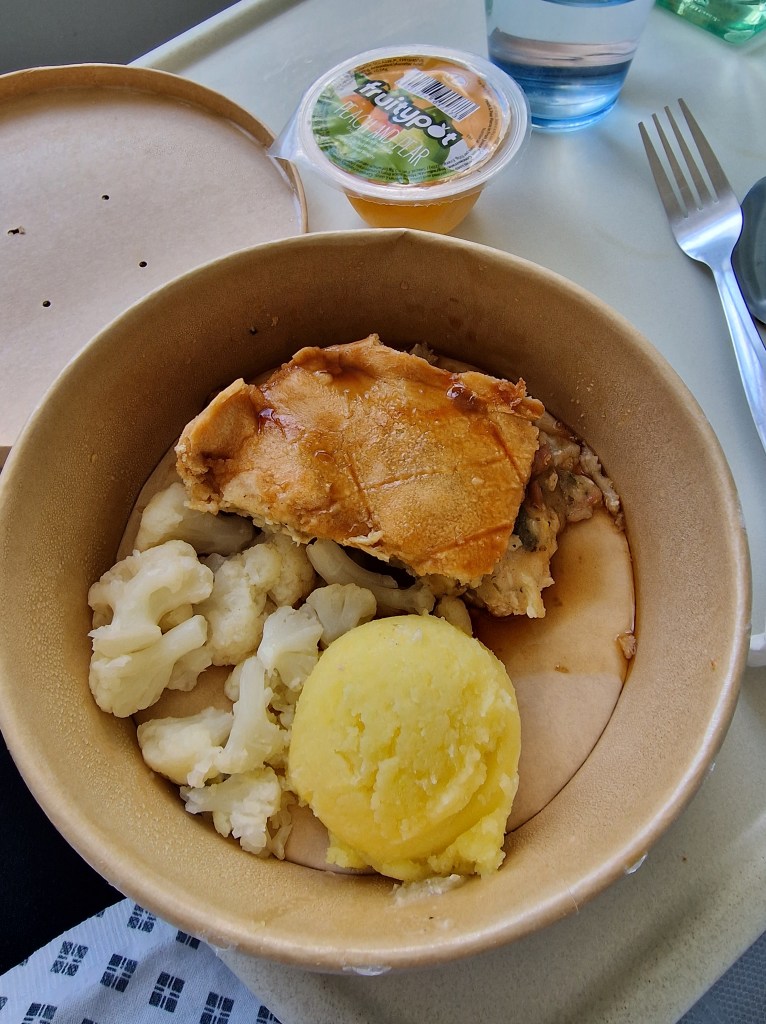I was offered the only low fat option on the menu, vegetarian moussaka, but this is one of very few items on the St Mary’s menu that I don’t like. I wasn’t very hungry, loss of appetite being a common effect of gallbladder issues, so was more than happy to go without lunch. That wasn’t allowable, though, so instead I got chicken and ham pie (“pick out the chicken, scrape off the sauce, don’t eat much of the pastry”), mash (which is heavily buttered and thus delicious but not something I should be eating), and cauliflower (which I will never, under any circumstances, eat).