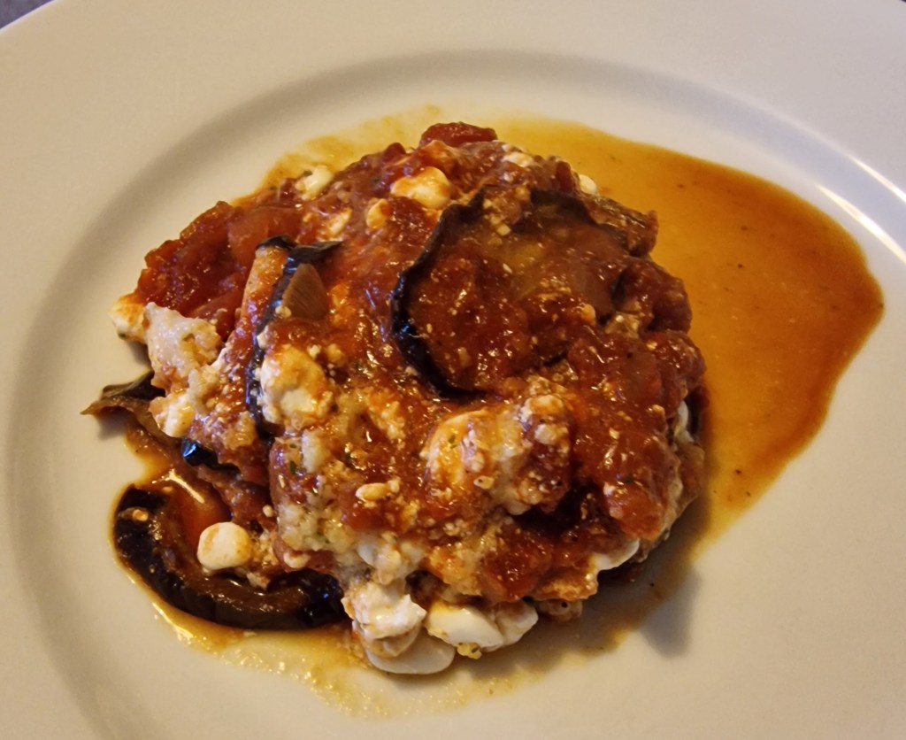 Dinner tonight was a classic aubergine parmigiana, but with the mozzarella replaced by cottage cheese. It’s surprisingly good, but then I’m very partial to cottage cheese anyway.