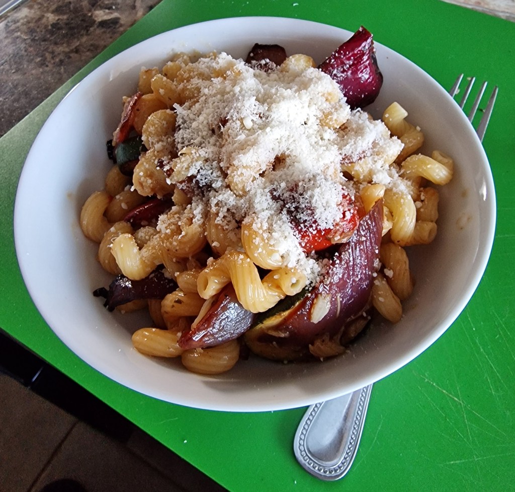 Which I did by mashing the roasted garlic with vegetable stock and some of the pasta cooking water, then stirred in the roasted veg and the pasta. Topped with more grated parmesan than I’ve risked for some time, it was very delicious: maybe because I didn’t have any lunch, it barely touched the sides.