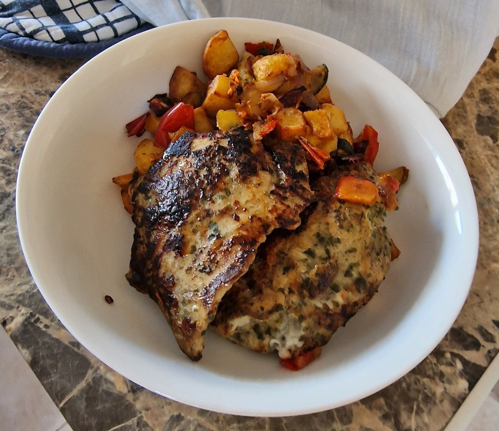 Garlic and herb chicken, Mediterranean veg and potatoes; apple strudel and honey yoghurt